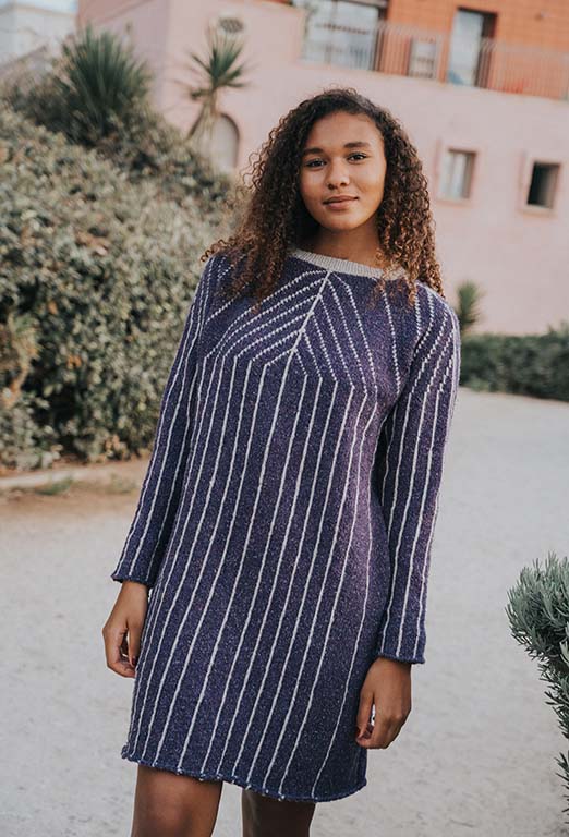 Vertical Limit is a unisex sweater knit top down in the round. It can be knit either to standard sweater length or, as seen on Dora, to dress length, and it can either include cuffs and a waist band or straight hems. It utilizes two colors, as well as vertical color work, which I personally think is more flattering. This sweater is appropriate for all levels of skill, as none of the techniques used are especially difficult. Go wild with color combos, or opt for neutrals; with this pattern, anything goes!